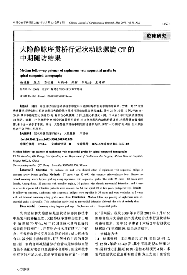 大隐静脉序贯桥行冠状动脉螺旋CT的中期随访结果