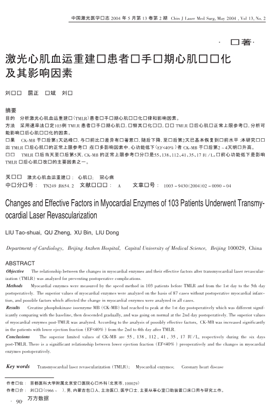 激光心肌血运重建术患者围手术期心肌酶变化及其影响因素
