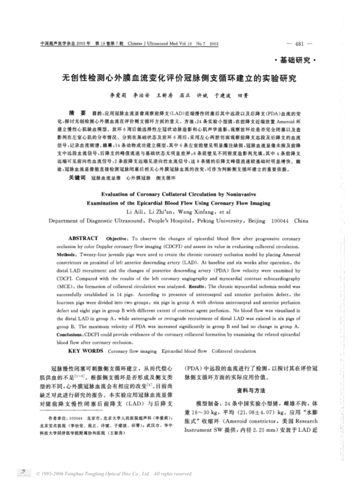 无创性检测心外膜血流变化评价冠脉侧枝循环建立的实验研究