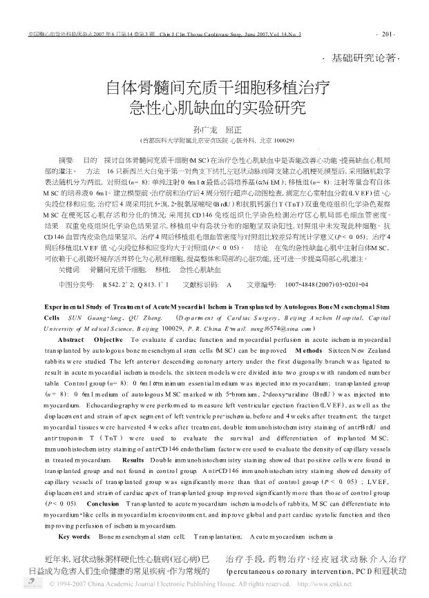 自体骨髓间充质干细胞移植治疗急性心肌缺血的实验研究