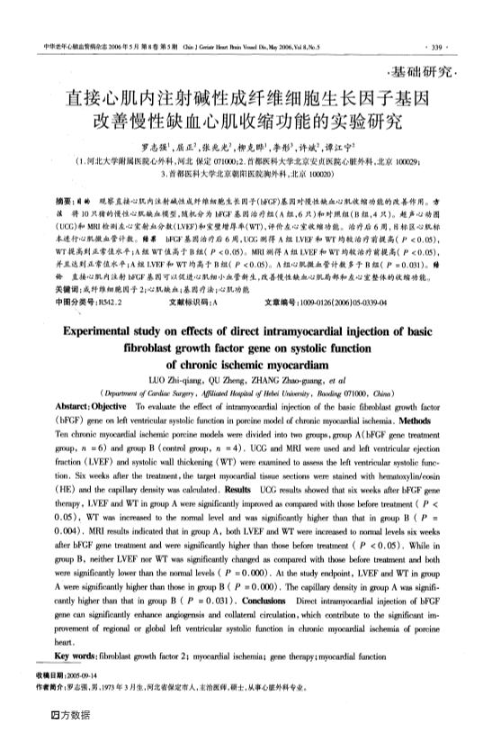 直接心肌内注射碱性成纤维细胞生长因子基因改善慢性缺血心肌收缩功能的实验研究