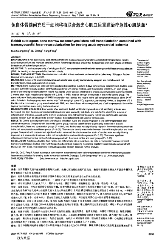 兔自体骨髓间充质干细胞移植联合激光心肌血运重建治疗急性心肌缺血