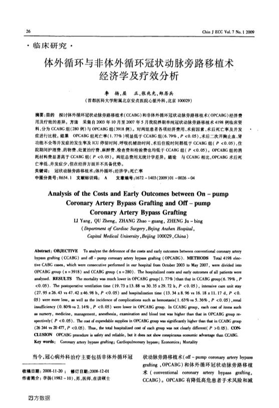 体外循环与非体外循环冠状动脉旁路移植术经济学及疗效分析