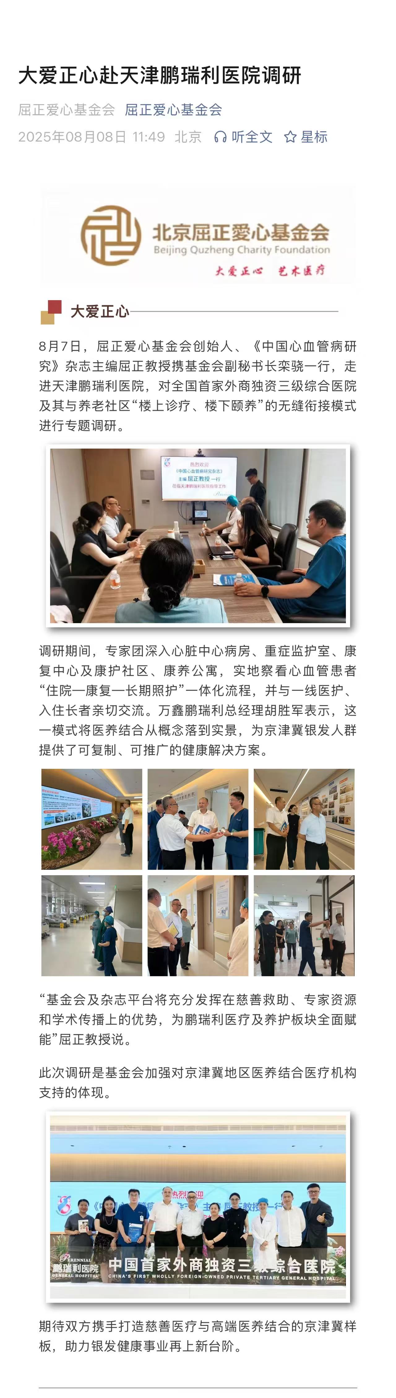 大爱正心赴天津鹏瑞利医院调研