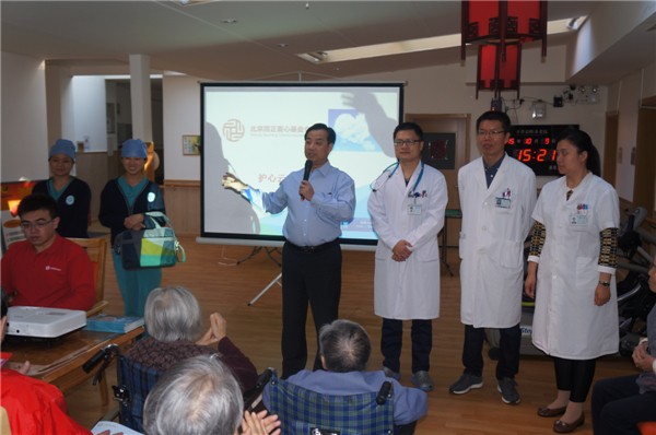 当养老院贾金凤院长从BQZ理事长、煤炭总医院副院长屈正教授手中接过“养老院护心云工程和平里工作站”的牌匾时,全场报以热烈掌声。屈正理事长向养老院的老人和工作人员介绍了护心云工程的缘起,发展历程和“养老院护心云工程”的服务内容。当他讲到BQZ为社区老人入户做心电图的时候,在座的老人高高竖起拇指。